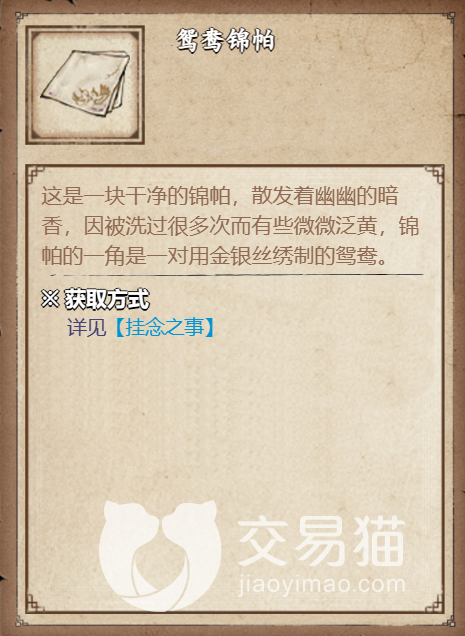 这个鸳鸯锦帕就是要带回去交给杜伟生的任务物品,杜伟生还是在原来的地方,大家可以原路返回,交给杜伟生,这样任务就完成了,整个任务可以获得声望以及书帖,任务的流程也非常简单, 玩家只需要跑两趟就可以完成啦。