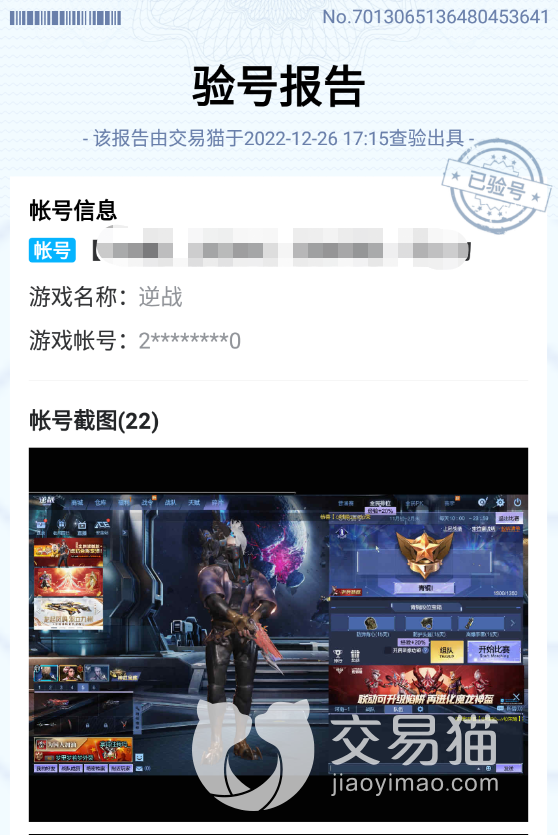 作为买家,最担心账号收到之后货不对版,而如果选择用交易猫就没有这个烦恼。因为交易猫平台上面的账号信息都有多维度展示账号的截图,部分账号还有官方验证的验号报告,点击平台验号报告的标签,可以查看账号大量的游戏截图,角色等级、装备、枪械、道具、皮肤等一目了然。