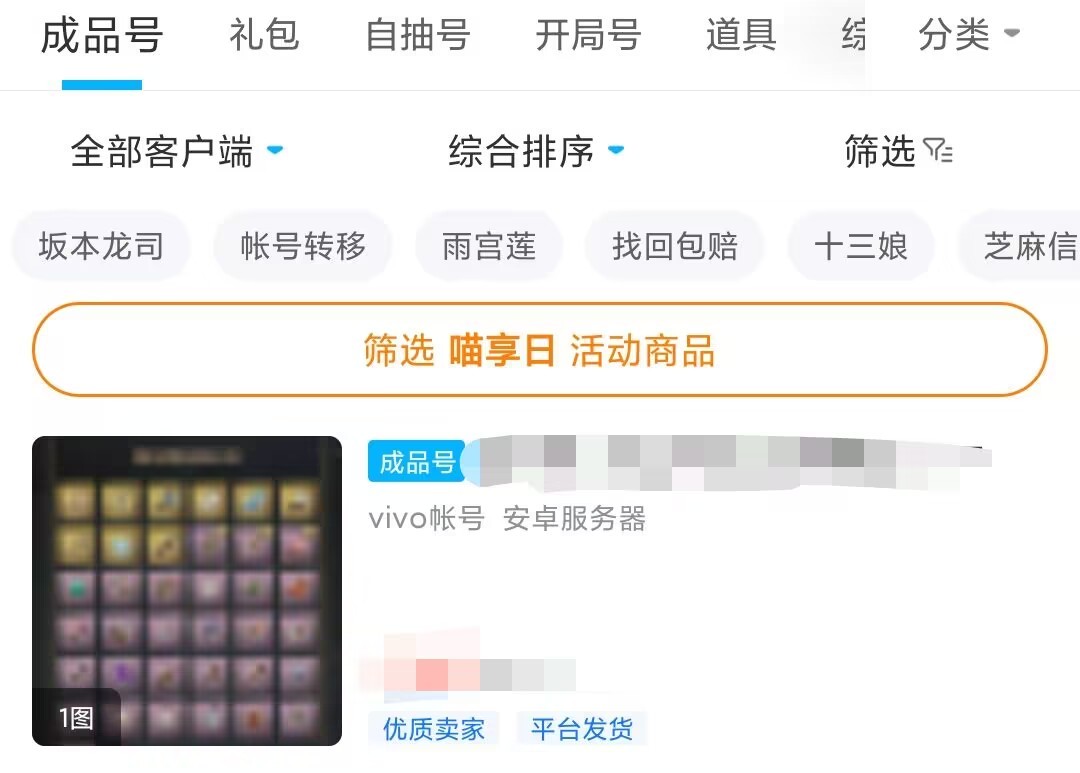 许多玩家出售小号的原因其实有很多,比如自己玩游戏的精力顾不过来,或者是小号任何氪金都没有都抽到了数十个限定金皮,这种账号挂在平台上至少500起步,所以如果对游戏内的某个角色时装有规定的话,那么就可以来在成品号专区内,根据皮肤的名称进行筛选部分商品,热门的龙司、十三娘都是可以直接购买的。