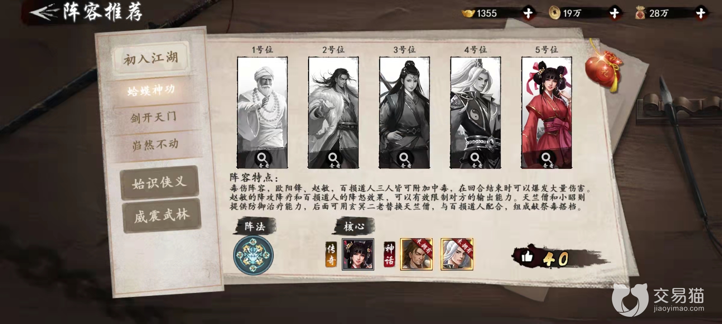 另外阵中的赵敏和百损道人还能分别为敌人添加降攻击和降怒气的负面效果,这对于敌人的输出进一步削弱,配合己方的持续毒伤可以很容易就磨死他们,中后期的话还可以拿蛛儿替换他们中的一个,组成完全体的毒爆流阵容。