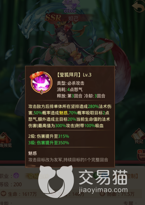 除了纣王以外,阵中的妲己也是很重要的,她的普攻加上两个技能都有一定几率能触发控制效果,当然,这个控制比较特殊,无法剥夺敌人的行动权,但可以让他们接下来的攻击都只会攻击自己的友军,此外在必杀的时候妲己还能降低敌人的怒气,从而削弱他们的爆发。