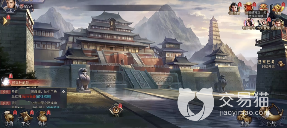 外出征战的话,也主要是跟随剧情进行闯关推进,其中碰到敌人后会展开回合制的战斗,除了主角以外,还可通过招募方式获得额外的武将上阵,当然,这些武将也都是需要培养的,不过游戏内的登录和首充活动都能提供大量的培养资源。