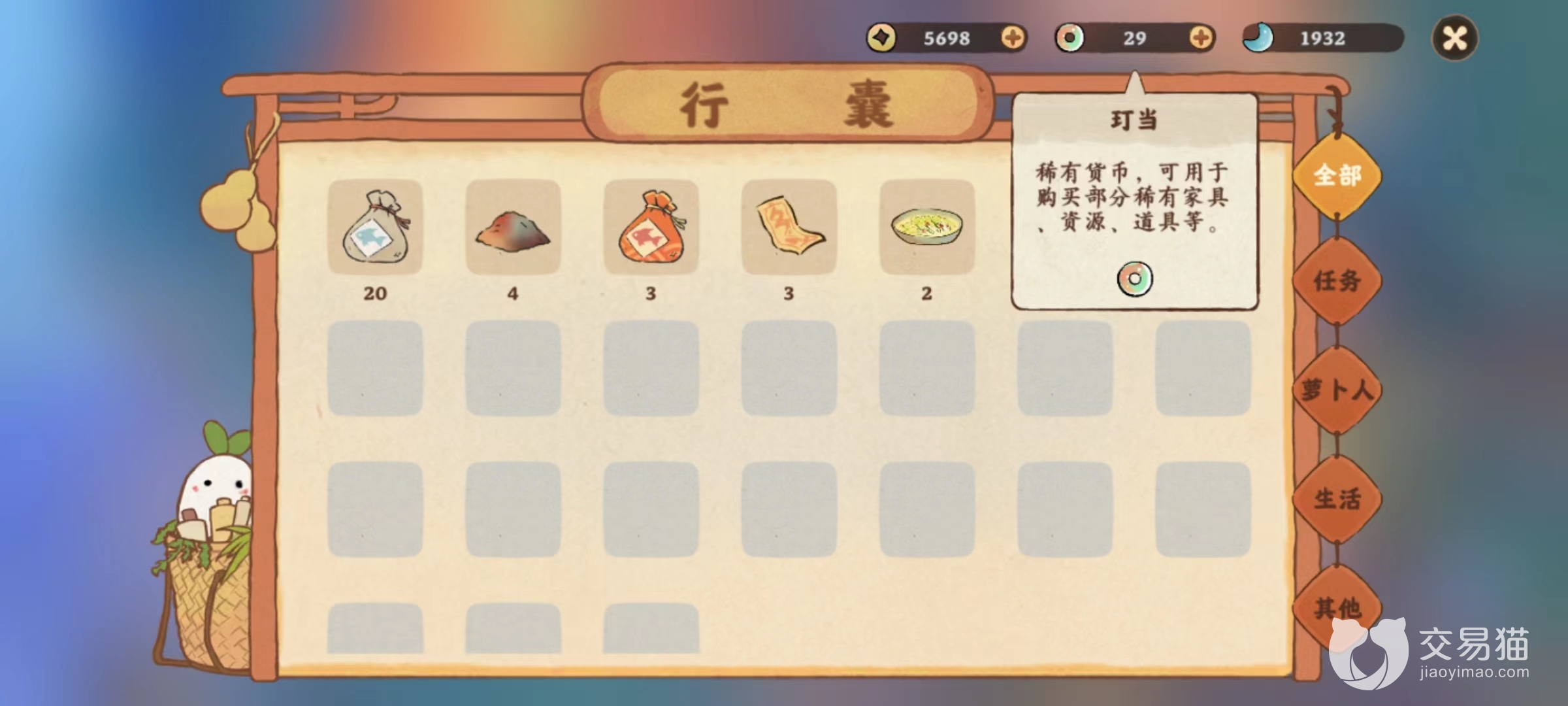 目前游戏内获取玎当的方法有很多种,首先玩家们可以使用萝萝币去兑换,兑换比例是1:10,其次玩家们也可以通过做任务获取,游戏内可以有很多不同类型的任务,例如提升舒适度任务或者解锁更多建筑材料任务,都是可以获取到到一定数量的玎当。