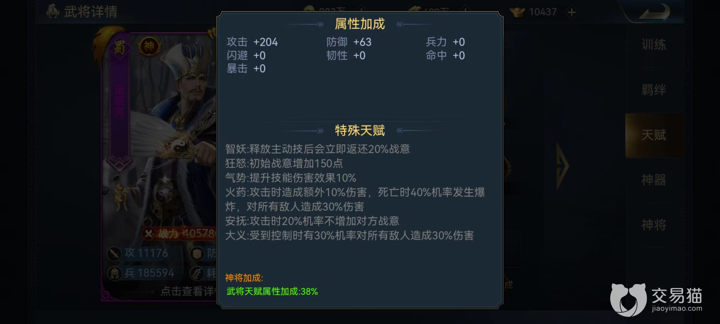 天赋相比于神将突破需要消耗的碎片比较少,在初始一重天的时候,每次点击只要消耗10枚碎片就能实现。所以在碎片不多的情况下,可以优先选择先升级天赋。在天赋页面中可以看到每次点击都会提供不同的属性,每一重天的最后一项内容可以获得特殊天赋加成。这里小编以诸葛亮为例,第一重天点满后获得智妖效果,当释放主动技能时会返还战意,第二重天获得狂怒提高初始战意,第三重天直接提升技能伤害效果,目前一共开放了7层特殊天赋。