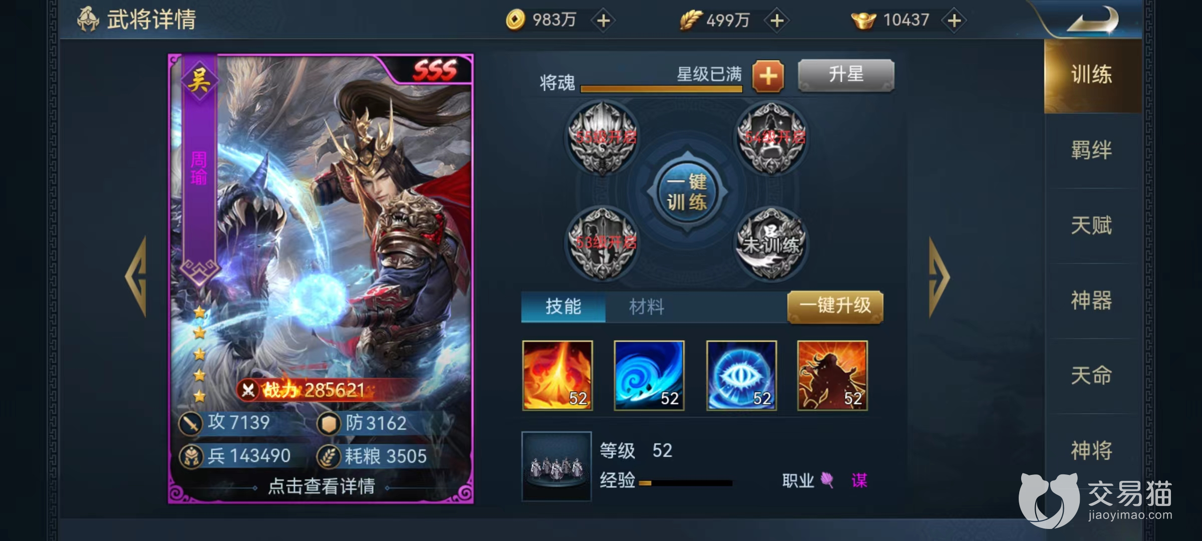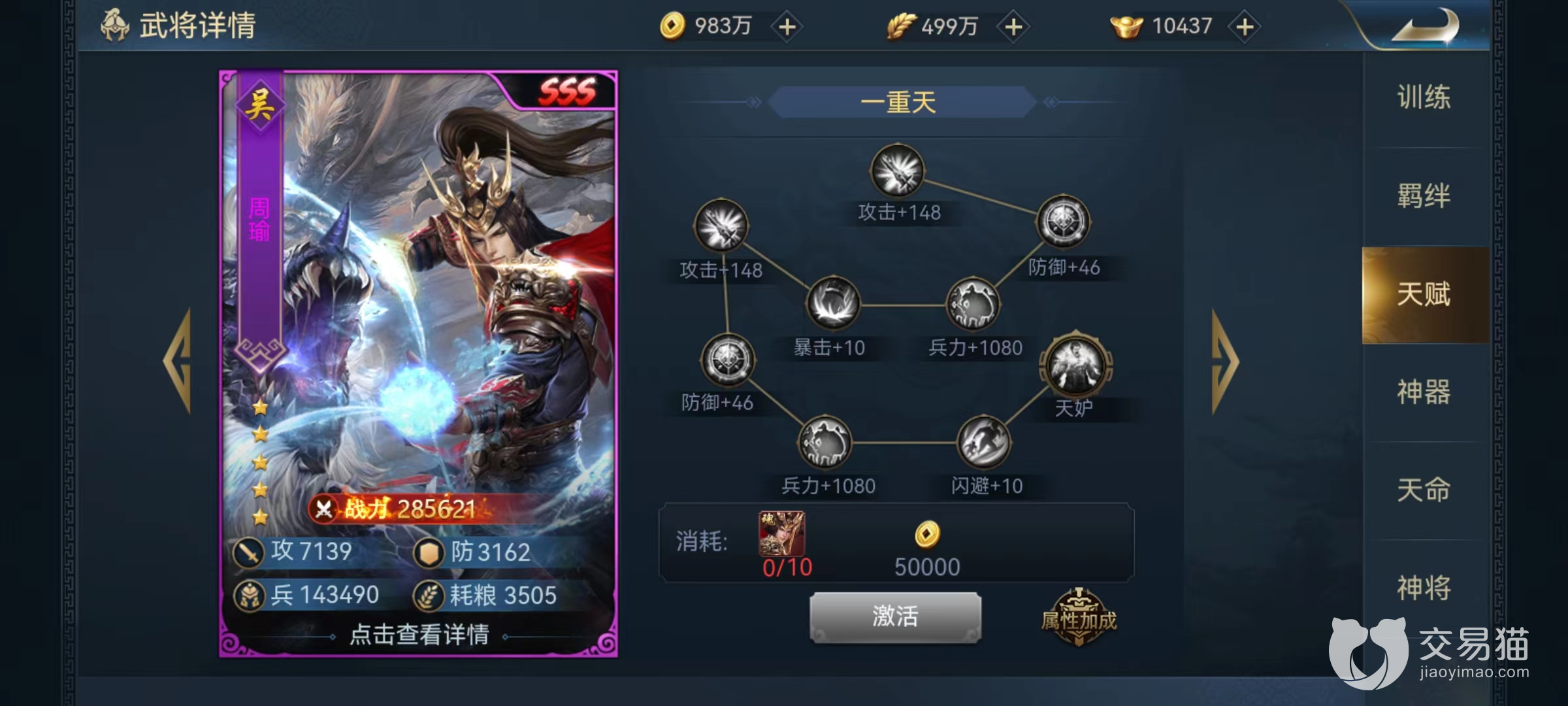 进入到武将培养界面后,可以看到有训练羁绊,天赋,神器,神将等多种不同的强化培养项目,中间的天赋就是今天要重点讲解的内容。之所以要强调天赋的重要性,是因为它所消耗的是将魂碎片,而武将升星和神将突破都需要用到同样的道具,这就带来了选择上的困难和优先级的判定。如果盲目的拿来将碎片用于强化天赋会导致发展不均衡,这里小编的建议是优先利用将魂将星级升满,目前5星就已经是最高的星级,先升满级之后再进行神将的突破和天赋提升。
