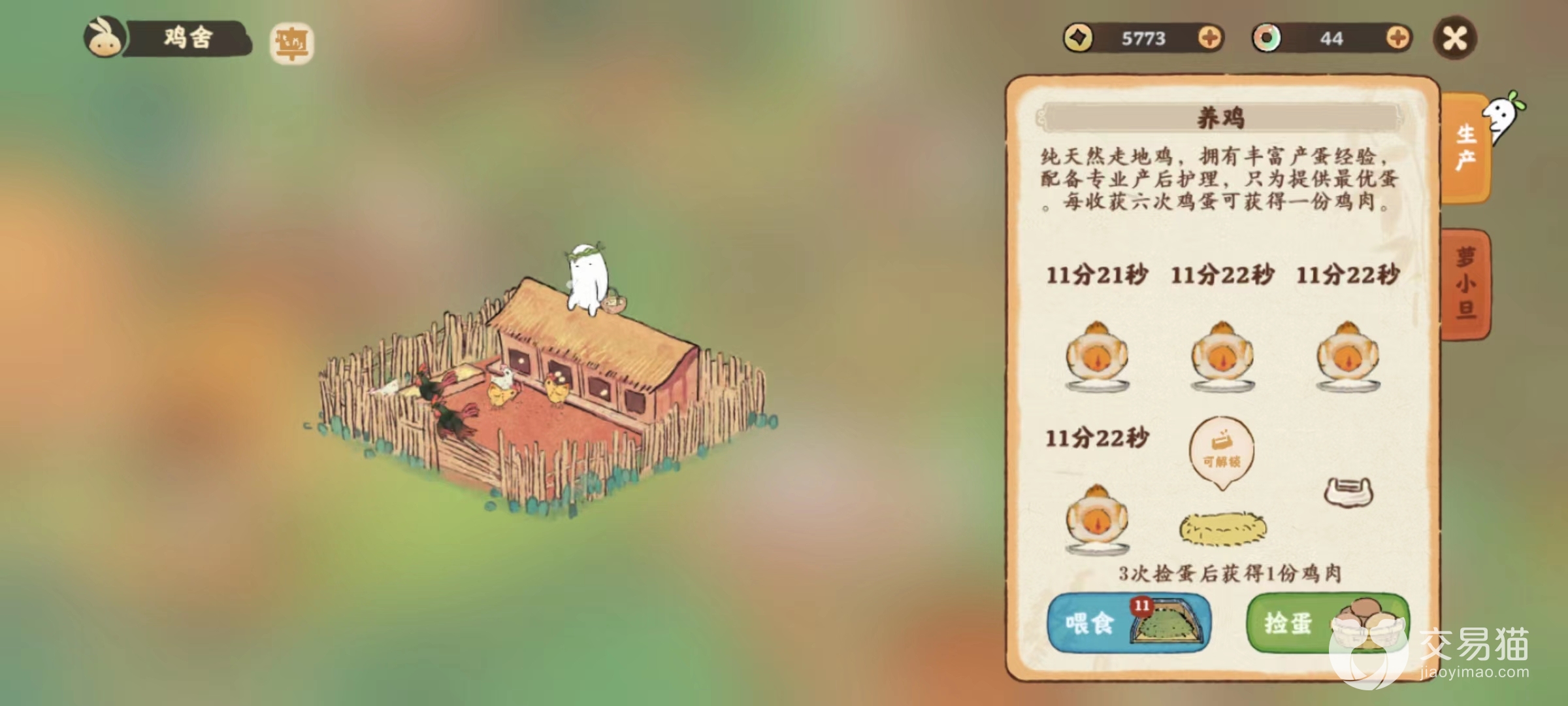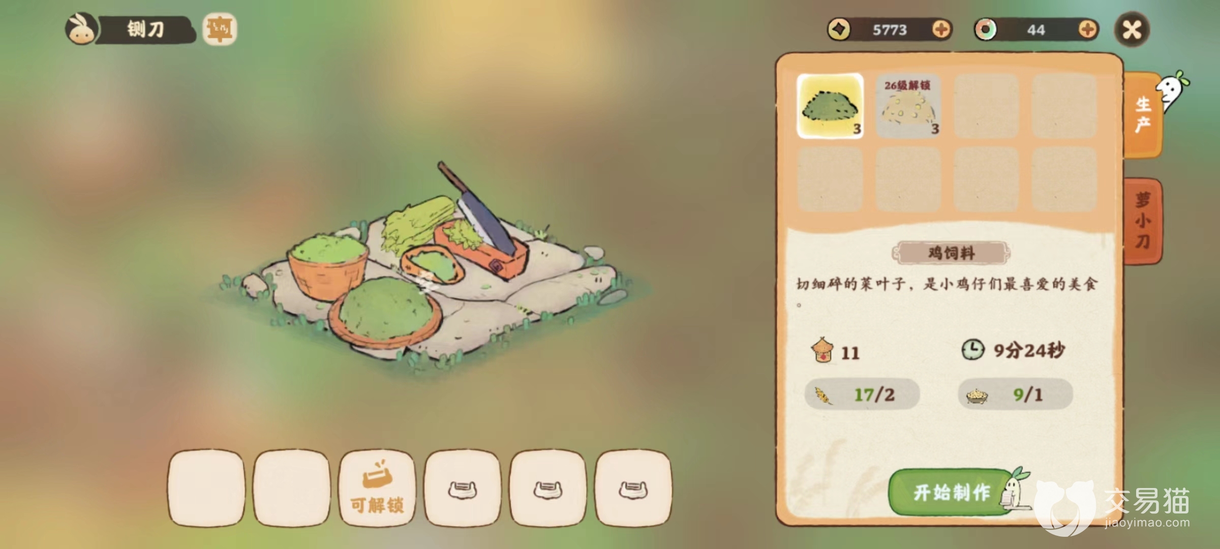 玩家们可以在3级之后解锁饲料制作工坊,在这里萝小刀会为我们制作各种各样的饲料,玩家们只需要准备对应的材料就可以,例如鸡饲料需要2个小麦,1个豆子就可以制作一份,时间为9分24秒,玩家们定时来收取就可以了。