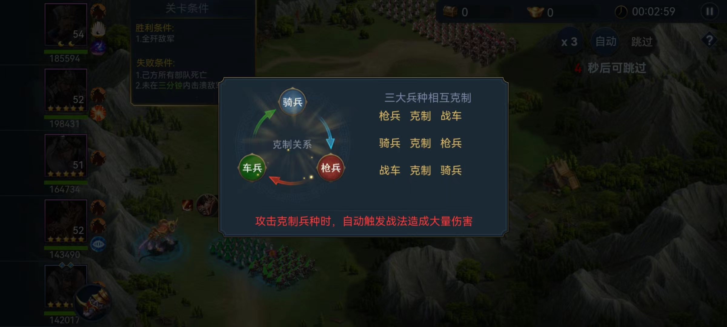 在具体的克制关系上,骑兵克制枪兵,枪兵克制车兵,车兵又反过来克制骑兵,形成了闭环循环,这样既不会有一方独大,也能相互制约,带来了很好的阵容搭配玩法。当出现兵种克制时有独特效果,例如骑兵攻击枪兵时,将会额外触发突击技能可以造成额外伤害。枪兵攻击战车兵时则可以触发技能奋迅,车兵攻击骑兵时可以触发技能碾压。这些克制效果不需要手动释放,每隔15秒钟就可以自动触发一次,而且伤害相当可观。