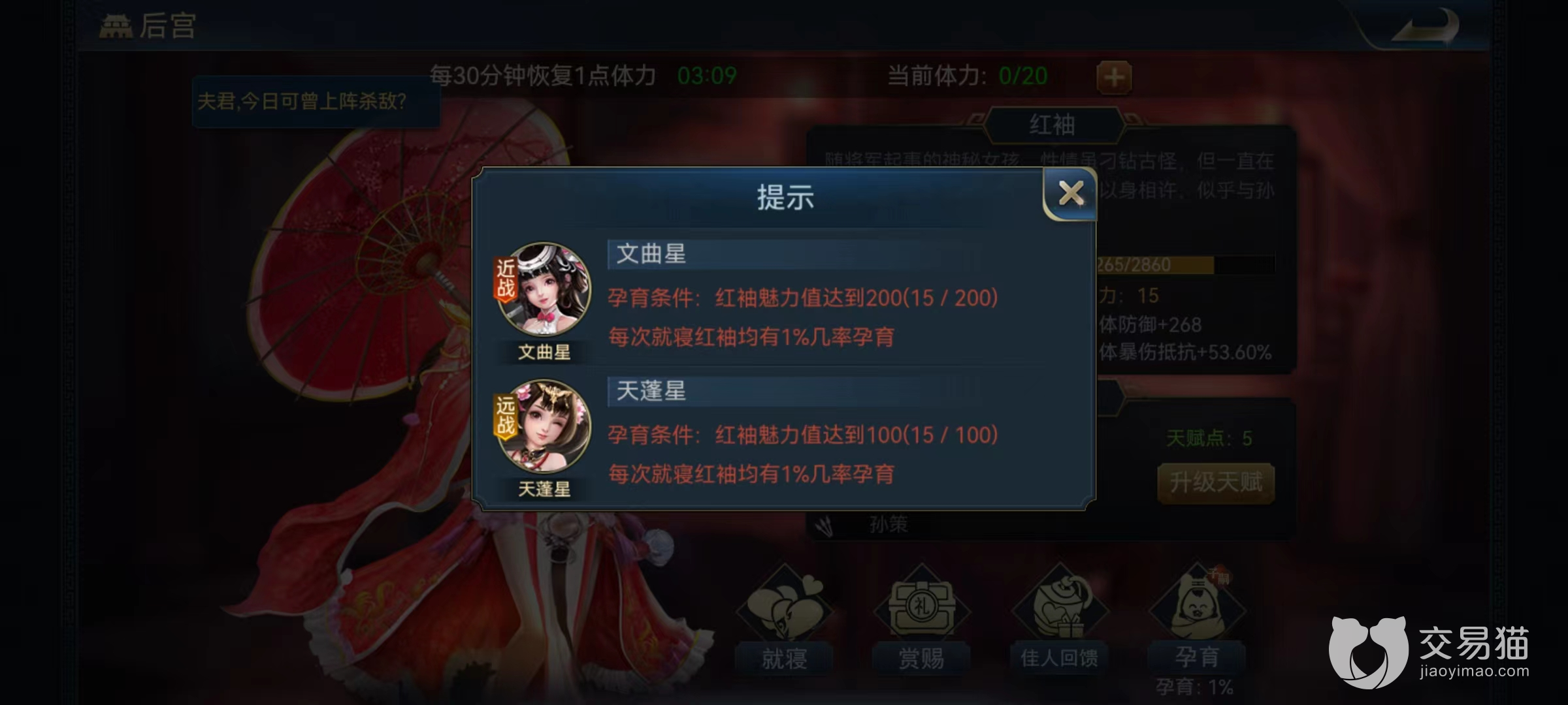 在主界面中可以看到后宫选项,点击进去中间是佳丽宫,在其中选择已经迎娶的佳丽,在就寝之后就有几率孕育出子女。子女出现的条件有两个,第1个是当前红颜知己的魅力值达到100或200,或者是每次就寝都有很小的几率直接出现子嗣。几率比较低所以还是提升魅力比较靠谱,当魅力达到100点时,可以获得远战型子女,到200点时可以获得近战型子女。