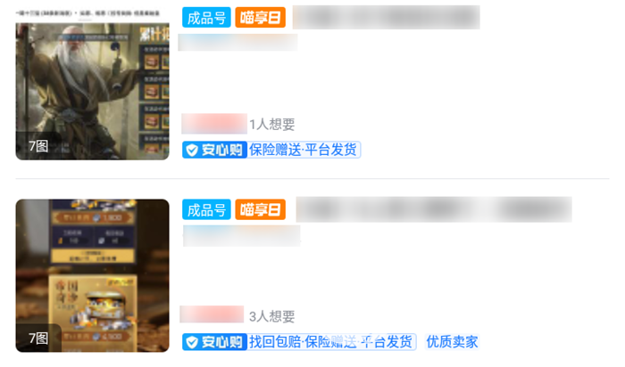 在交易猫中搜索重返帝国这个游戏的名称就能够返回出一些商品,大家可以注意到,在列表中这些商品都会带有不同的标签,这也是其拥有着不同的服务。比如说图中,两个成品号都带有喵享日的标签,这代表这两个账号都有着相当大的优惠力度,购买的时候是可以获取到优惠减免的。部分账号都带有一些安心购的服务保障,但是具体支持的项目却不同。