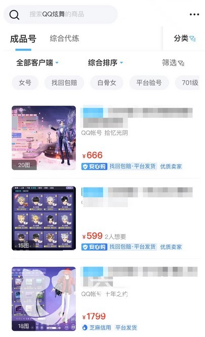大家都知道我们在平台上买卖账号,如果一个平台的用户数量不多、不活跃,对卖家来说自己上架的账号是没有曝光率的,很难出售;对买家也同样找不到自己满意的账号。而交易猫凭借多年运营积攒的口碑和庞大的游戏库,有着海量用户和账号资源。支持找回包赔的部分商品、各种资源和套装的qq炫舞号搜索都可以找得到。
