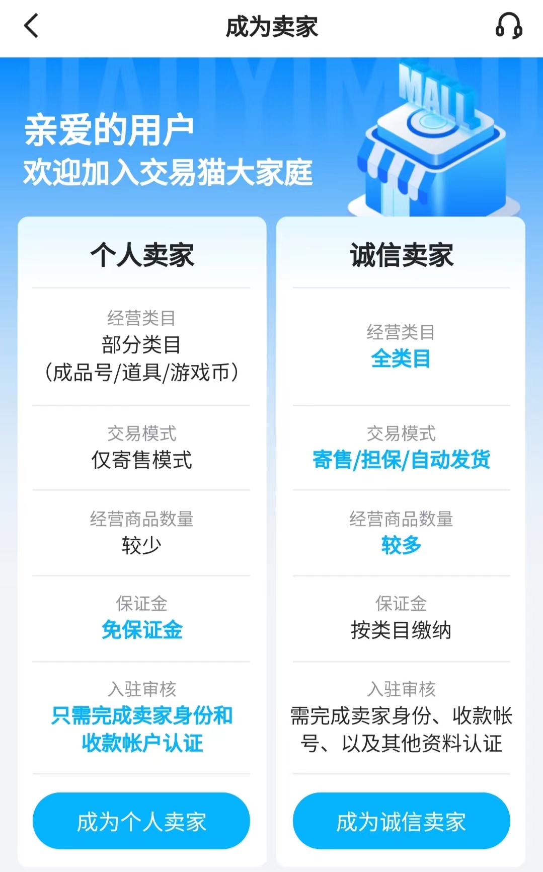有人可能会说,数量不一定能说明质量,还需要平台的严格管理才会越来越好。这句话非常中肯!交易猫平台从一开始就严格贯彻用心做好每一单的战略方向,从平台卖家的审核环节开始就严格把控,如果想不受限制地经营更多商品,那么“诚信卖家”绝对是最适合的选项。相对应的“个人卖家”在平台内并不能开启全部功能,例如交易模式就局限为寄售模式。