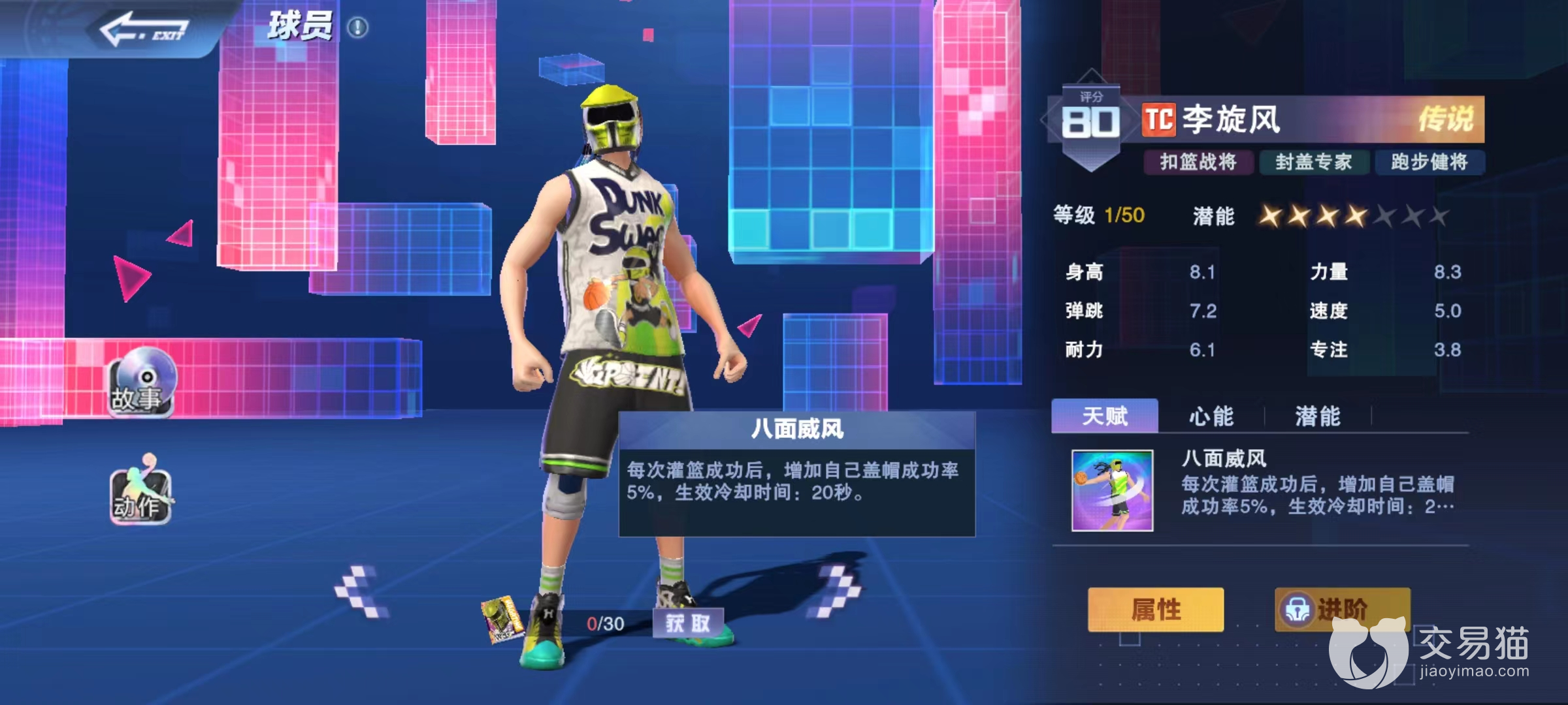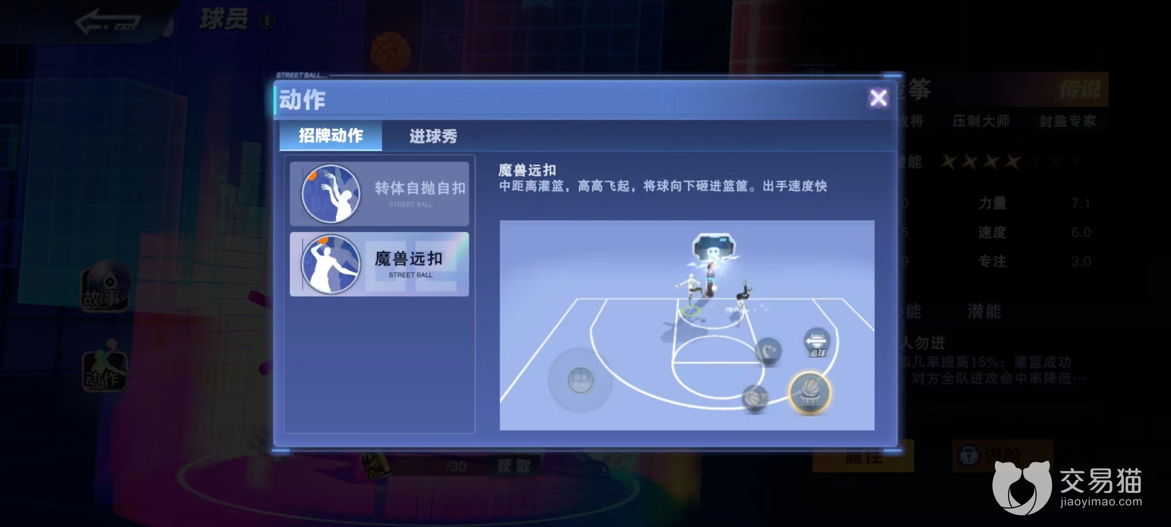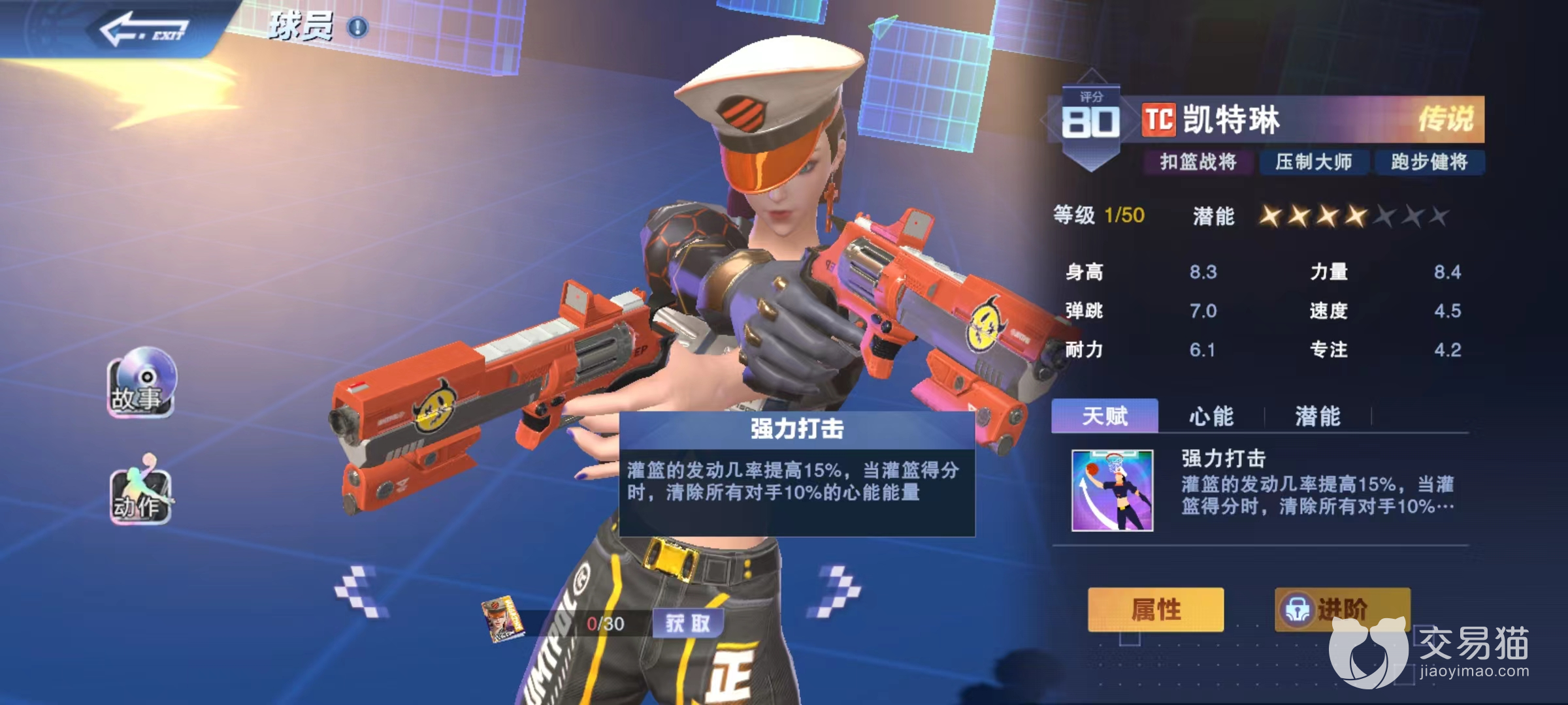 这也需要讲一下扣篮并非是100%可以用出的动作,拥有发动机率,可以通过天赋或是潜能来提升。如果想要走扣篮路线那么在强化潜能的时候就要有所侧重,例如凯特琳的天赋扣距强化就可以扩大扣篮发动的范围。接下来李旋峰同样擅长扣篮,天赋八面威风,当扣篮成功后可以额外增加盖帽成功率,这一点并没有提高成功率,所以在推荐方面要在凯特琳的后面。好在心能效果可以使其掌握旋风灌篮的技能,无视对方干扰。拥有招牌动作战斧灌篮和大风车灌篮,特点是提高扣篮距离,出手速度快。
