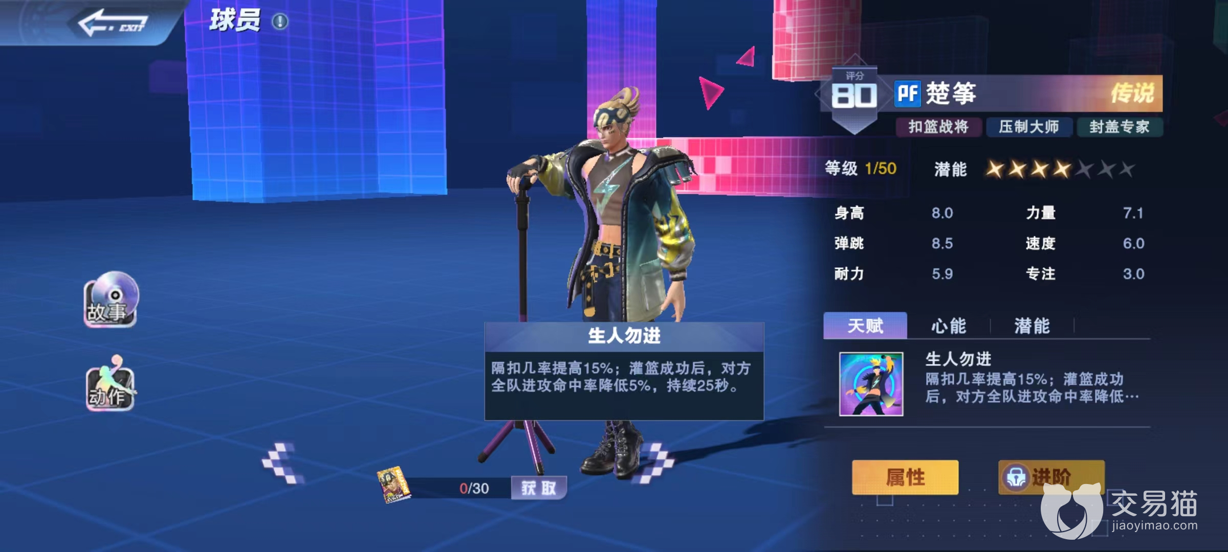楚筝招牌动作是转体自抛自扣和魔兽远扣,拥有出手速度快,难以被盖帽的特点,天赋生人勿近,提高格扣几率,并且当灌篮成功时降低对方进攻命中率。楚筝的这一天赋就代表了灌篮的另一个特点,当成功时能够降低对方状态,这也是大家非常喜欢灌篮的另一项原因。