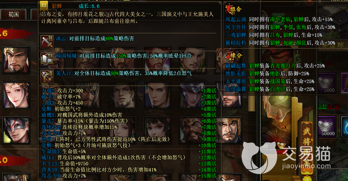 貂蝉:作为古代的四大美女之一,在游戏中也是非常强大的,但是相比较太史慈,貂蝉则是负责对敌人的前排造成伤害,而且魅力的颜值还诱惑敌人,对敌方造成伤害的同时还能够造成控制效果。非常适合一些喜欢动脑的玩家。而且羁绊组合还能够增加攻击属性。