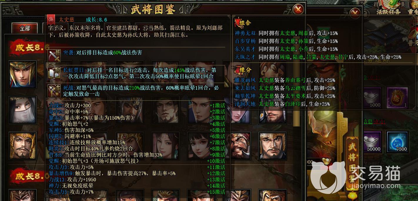 太史慈:普通的攻击能够偷袭敌人的后面并且造成大量的伤害,而怒气技能也是主要切敌人后排为主。由于对方的后排通常是负责输出的武将,如果后排的武将被击杀了,那么我方的阵容就很难被击败。如果有羁绊组合搭配,还会增加大量的生命属性。