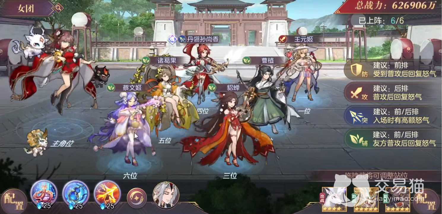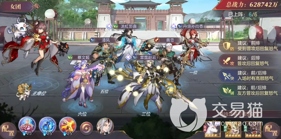 与其他游戏不同,这款游戏在玩家进行阵容配置时,右边除了显示战斗力以外,还会有放置建议,比如前排会建议我们放置防御类,后排则是放攻击,小编首先给大家推荐的这个阵容,前排为王元姬,这个也是此阵容唯一有一个主输出角色,然后是曹植、貂蝉,后排可以放上丹翎孙尚香,如果手上有诸葛果和蔡文姬也可以一起上阵,这套阵容不管是pve还是pvp都非常的实用。