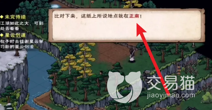 提示中指示需要玩家往地图上的正南方向去,大家往上面指示的方向走就可以了,后面到达目标点以后就会看见上面的叹号消息,随后大家需要在包裹当中找到挖掘宝藏的工具,一把铁锹,点击铁锹详情中的挖掘,在这个目标处大家可以进行挖掘。