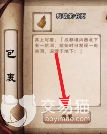 大家想要获取成都宝藏首先,你必须获取一个残破的书页,这个道具是大家在野外打怪的时候有机会掉落的道具,有了残破的书页这个道具以后大家可以打开包裹找到这个残破书页,点击这个书页大家可以获得其中的提示。