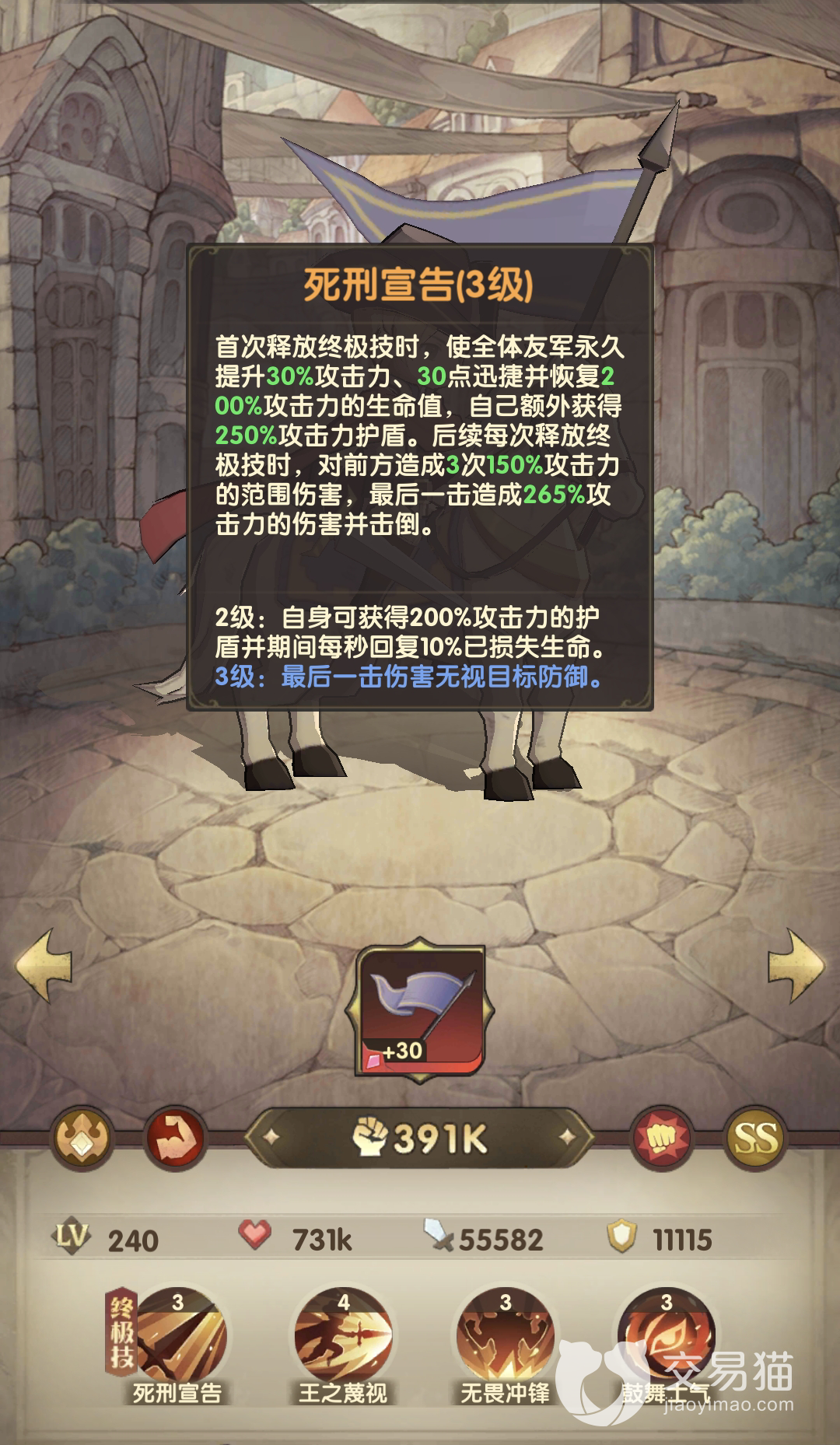 死刑宣告:这是拿破仑的终极技能,在最初次释放该技能时,整体有军的攻击力都会提升30点速度。也会得到增强,生命值也会恢复很多,是一个不折不扣的综合性技能。拿破仑也会根据为队友回复的血量自己增加护盾。如果不是第一次释放,拿破仑就会对敌人连续三次造成范围伤害,最后一次在原本伤害的基础上增加265%攻击力的伤害,并且施加控制效果。