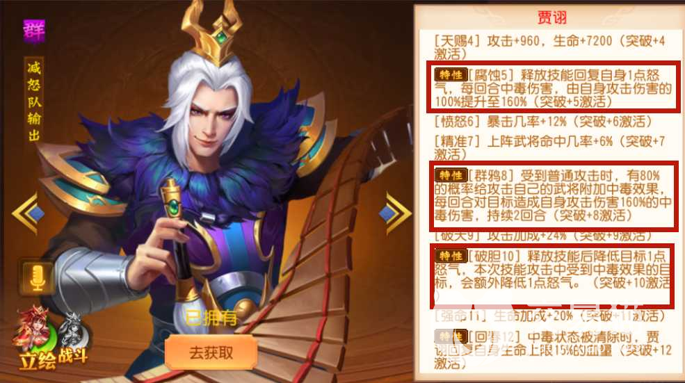 然后是贾诩,我们可以看到他的特性是非常多的,既可以释放技能让自身回复怒气,还可以在给敌方造成伤害的时候,附带毒性伤害,并且当自己受到攻击的时候,有还有一定几率让攻击自己的目标也获得毒性伤害,如果中毒状态被清楚了,贾诩还会恢复一定的生命值,非常的好用。
