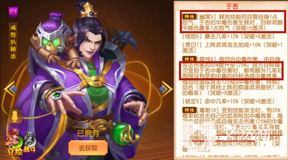 最后是于吉,这个角色与贾诩有点像,就是可以释放技能让自身回复怒气,并且在给敌方造成伤害以及被敌人伤害的时候,有一定几率附带毒性伤害,并且于吉的中毒效果使敌方死亡了,那么还有几率使中毒效果转移到其他周围目标身上,是个非常好用的技能。