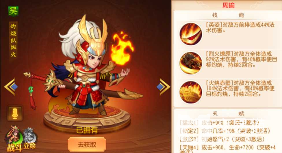 首先是周瑜,他可以对目标造成一定的法术伤害,并且其技能“烈火燎原”还可以对敌方所有目标,并且还有一定概率使目标获得2个回合的灼烧效果。