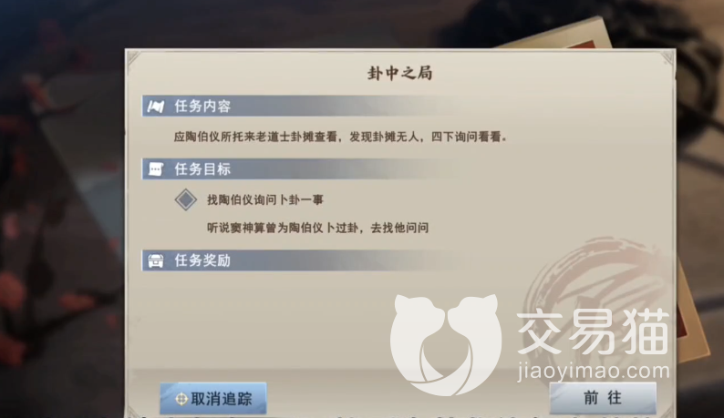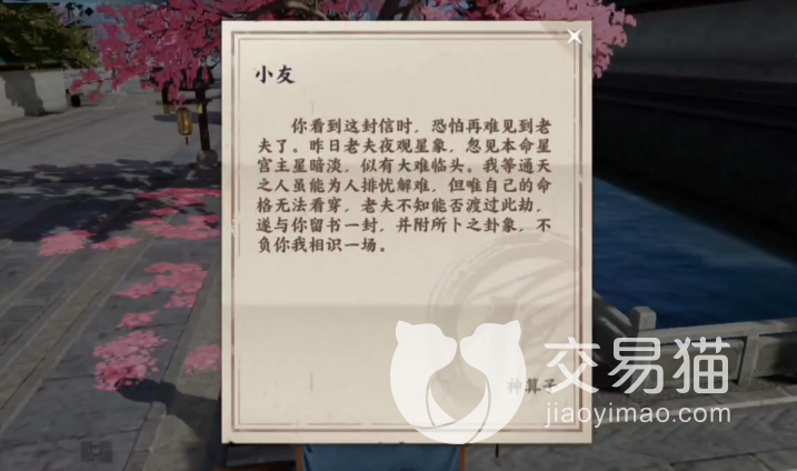 然后与其对话后就会得知算命先生被抓走了,之后再依次找到卦摊对面的老乞丐,对面桃树下面的王某人等,之后经过一系列的询问再回到摊位前就会看到一封信,然后这个任务就结束了。