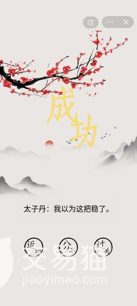 例如有名荆轲刺秦王是历史上著名的时间,如果在关键时刻不解救秦王游戏里秦王就会被荆轲杀死,历史改变了游戏就结束了,所以要在中间的柱这个字里找出长剑给秦王然后劈向荆轲游戏就算尊重历史顺利过关了,并且会得到一段历史名人的点评,意味深长。