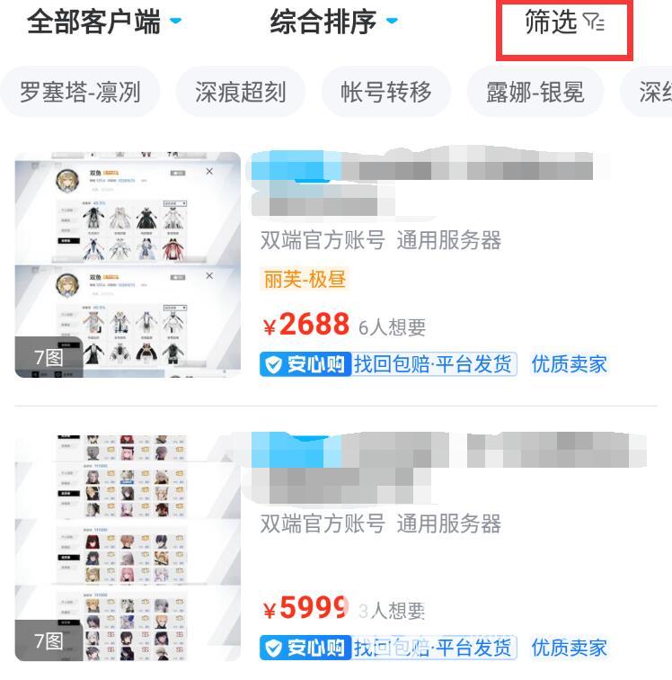 在平台当中,有很多战双帕弥什账号在售,上面记录了账号内的资源、发展履历等,由于初始角色就那么几位,所以大家可以在这些账号中,参考一下号主们的选择,简单来说就是在平台找一些大神号,随后学习一下他们是如何选择的初始角色。要知道这账号数量相当可观,如果担心自己找太费事的话,也可以尝试一下右上角的筛选功能,直接将想看的角色勾选上,平台会自动整理出来,很方便。