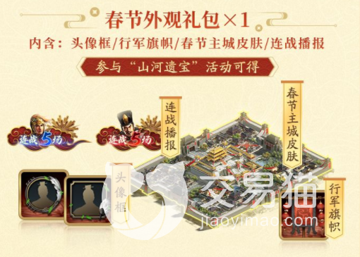 参加山河遗宝活动,则可以获得春节外观礼包,头像框,主城皮肤,行军旗帜,可以把整个游戏过程都带进春节的喜庆氛围中,无处不见春节元素,此外像红包封面,限定聊天框和节日宝箱都可以通过参加活动获得。