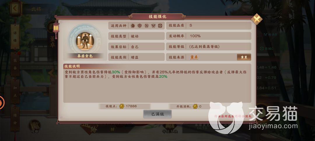 随后我们聚焦董卓的技能,其S级技能“暴虐贪色”,属于必定发动的被动技能,作用于自身。可以降低自身受到男性武将的伤害,并且有25%的几率反弹伤害给攻击者,当然反弹的伤害量有一个限制,最大不会超过自身当前兵力。但相应的代价是受到女性武将伤害提高。