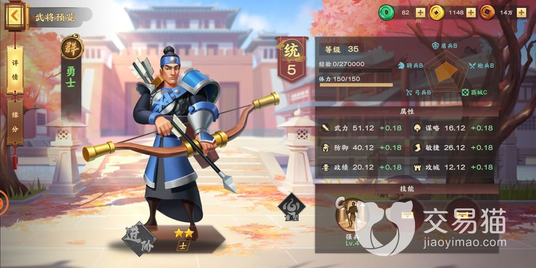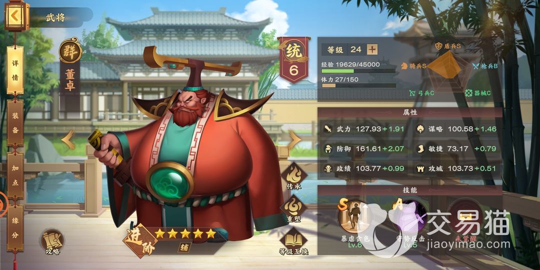 在许多三国题材的手游中董卓作为一方诸侯,多是SSR级的,胡莱三国4中也是如此。群雄阵营的他,擅长统御骑兵和盾兵。在武力、谋略、防御、政绩、攻城各方便表现都不俗,只是敏捷性稍差。私以为这是有点惯性思维了,“大胖子”形象深入人心,想当然觉得敏捷性一般。