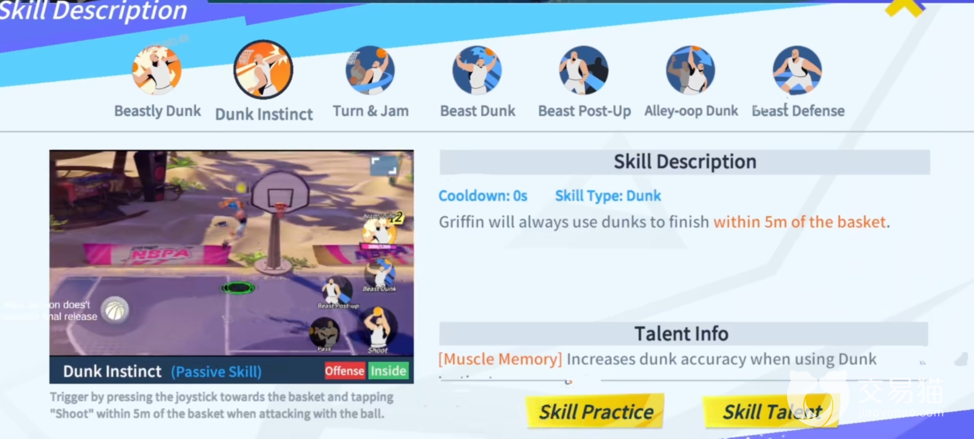 首先来讲一讲格里芬的橙色主动技能。此技能可以使他直冲篮筐,完成野蛮隔扣的帅气动作。这一被动需要能量1200点,最大两次充能,共可以升级三次,升到一级时可增加扣篮的力量预判,二级时可以增加扣篮的抗盖帽属性,若3级扣篮成功,则会增加格里芬后续场次的篮球命中率。接下来再介绍一下被动技能——野兽本能,在5m范围内格里芬将会百分之百触发扣篮。