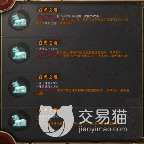 白虎之魂:一号位置的时候可以让玩家在对敌方造成近战伤害的时候一定的概率可以对敌方造成一次高额的伤害;二号位的时候可以给玩家增加伤害;三号位的时候可以给玩家增加攻速并且还可以增加一定量的移速;四号位可以让玩家们在近战攻击的时候提高输出伤害和防御属性。