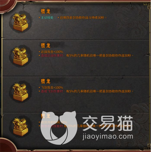 堕龙:一号位的时候可以召唤四圣剑出来协助玩家进行战斗,二号位的时候可以增加玩家们在游戏内的近战攻击伤害;三号位的时候就可以增加100%的飞剑攻击伤害;四号位的时候可以减少玩家们在战斗中的收剑技能冷却时间,并且有一定的几率可以召唤出一把圣剑协助作战。