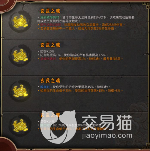 玄武之魂:一号位置的时候玩家们携带了该圣物的时候在受到致命伤害的时候可以对周围敌方单位造成大量的伤害,该伤害每攻击到一个敌方单位的时候就可以回复玩家一定的生命值;二号位可以给玩家增加10%的攻击伤害;三号位可以让玩家们在游戏内获得大量的治疗回复效果,四号位可以提高玩家自身的防御能力并且在受到伤害的是可以还可以回复一定的气血值。