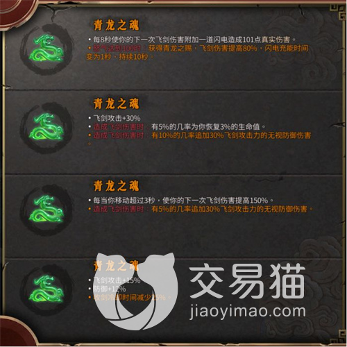 青龙之魂:一号位置的时候可以让玩家们每过八秒钟就可以让自己的飞剑伤害附加一层雷电真实伤害;二号位的时候可以让玩家在对敌方造成伤害的时候回复一定的生命值,三号位的时候只需要玩家们在持续移动就可以提升自己的飞剑伤害;四号位的时候可以增加飞剑的伤害值和防御值,并且附带附加效果减少飞剑的冷却时间。