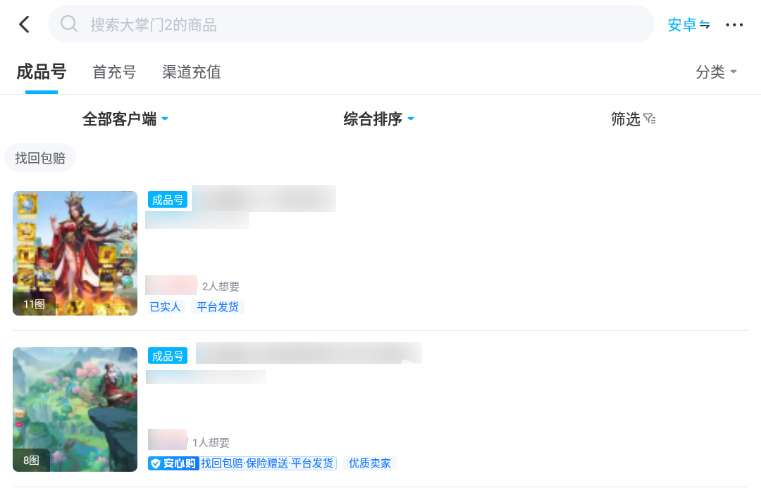 这款游戏虽然人气上比不上很多热门的大作,但其实还是有着一定的玩家数量基础的,我们打开交易猫搜索游戏的名称就能够看到对应的交易专区,这里就有大量的账号商品供大家选择,甚至还细分成为了首充、成品两个种类。在检索的过程中,我们不仅能够看到这些账号的内容以及对应的价格,而且还可以通过下方的标签来看到其中包含的特色服务,像是平台发货、找回包赔这些服务,都是能够提升购物体验的。
