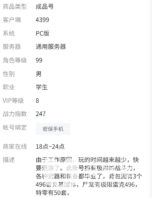 交易猫对商品介绍的要求很高,卖家得根据模板来介绍账号,所以大家在看的时候就是一目了然,能让你知道游戏的服务器和具体内容,感兴趣的话再去和商家深入了解,一些细心的商家描述都很仔细,这样也节省了双方的时间,如果满意的话再去问,不满意的话再去看其他账号。
