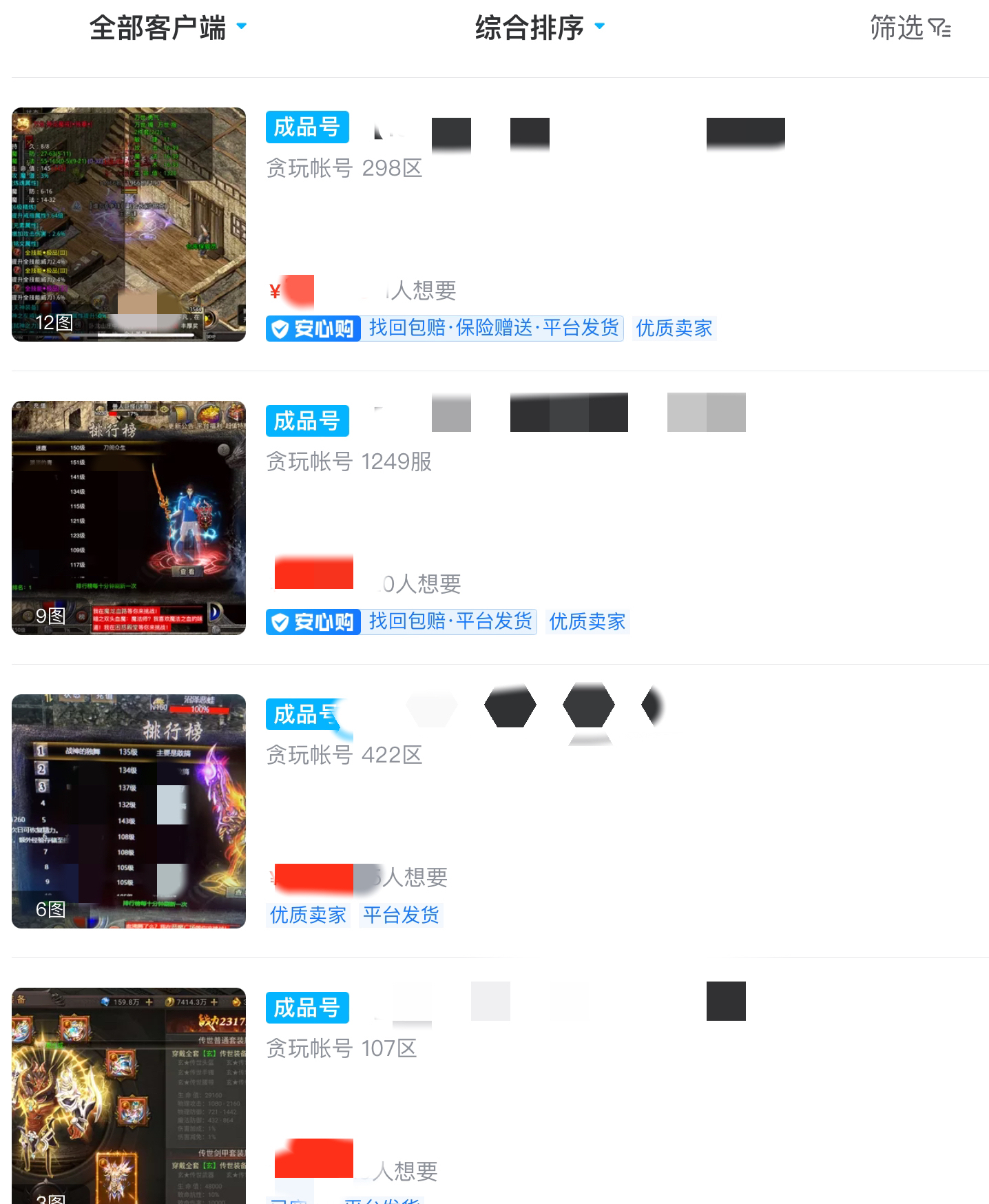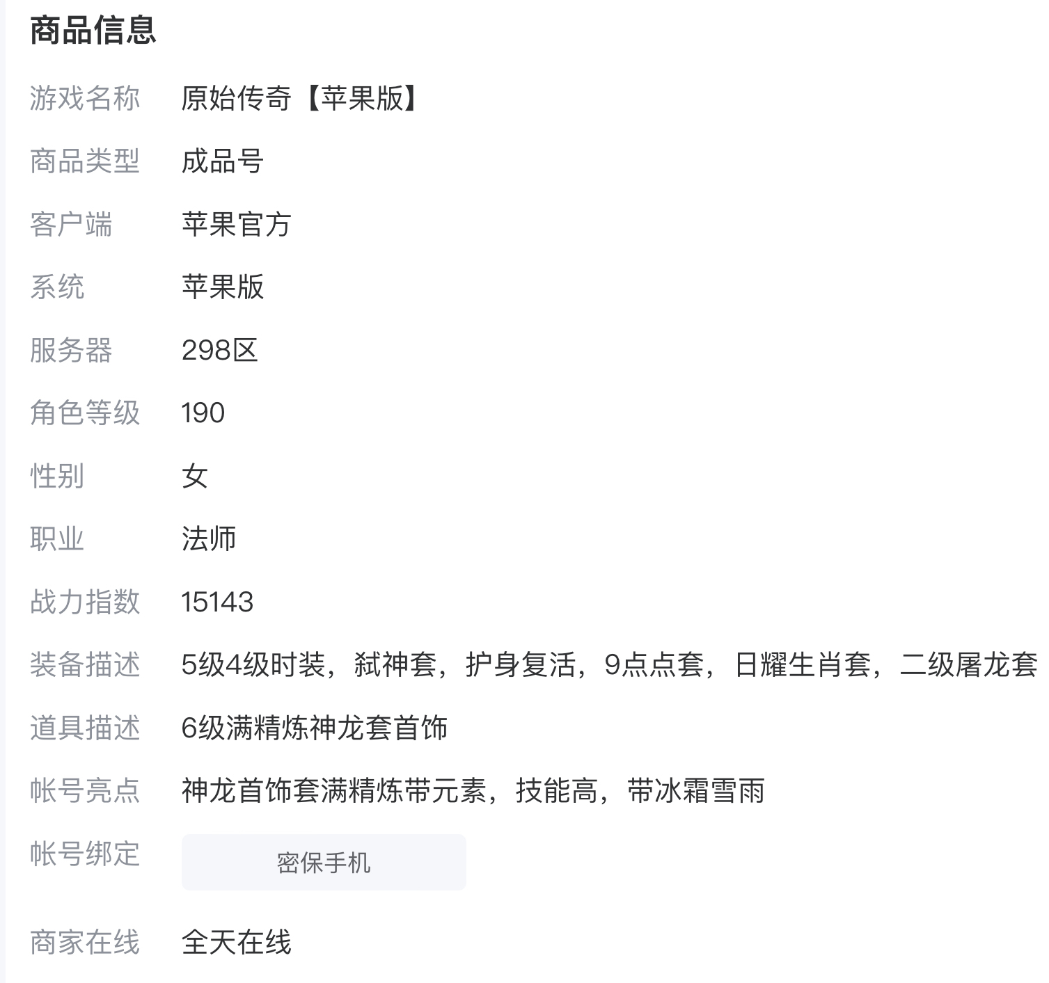 玩家在挑选游戏账号时,能够清晰地看到在商品详情界面展示的游戏账号信息,包括但不限于系统、服务器、职业、等级、装备、道具等等,玩家可以快速筛选符合自己条件的游戏账号,缩短时间成本,更加快捷地得到原始传奇的游戏账号。