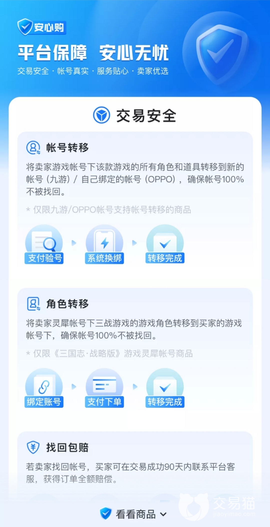 第一,交易猫平台对交易安全非常重视。虚拟交易,最重要的就是安全!如果没有安全的交易环境,别的再好都是白搭,这一点交易猫就做的很好。带有安心购标志的账号都经过官方核实,极大程度减少了售假的情况。交易期间,有官方全程保驾护航,即便是交易结束之后,卖家对安心购账号有任何问题,官方都会及时的答疑解惑。
