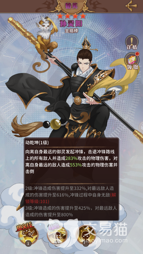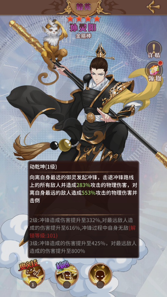 主C:孙灵阳。可能有朋友会好奇为什么拿一个四星的御灵作为主C,确实,在中后期这种四星,而且技能还是单体伤害的角色很难承担起队伍的输出重担,但本文说的是前期,从上图不难看出它虽然伤害主要是单体,但其实还是能对冲刺过程中阻挡的敌人造成溅射伤害的,而且对后排高达553%的伤害加成,前期的输出角色中也只有他一人。