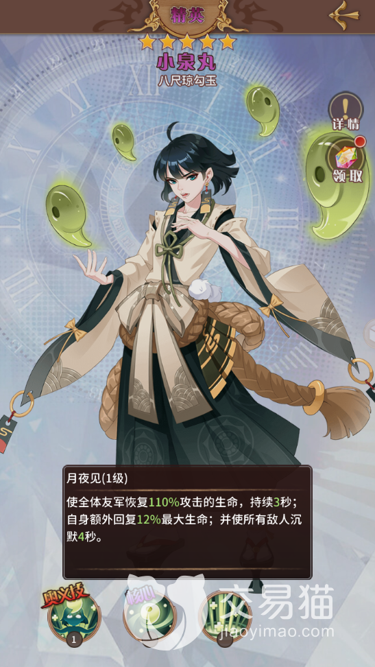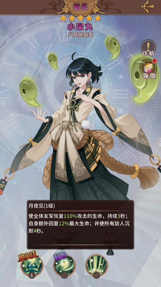 辅助:小泉丸。这一位的话其作用就纯粹是回血了,前期容易获得的优质辅助并不多,能群体回血的更是寥寥无几,而她属于一个免费赠送的角色,除了群体加血以外甚至还能沉默敌人,所以性价比已经很高了。