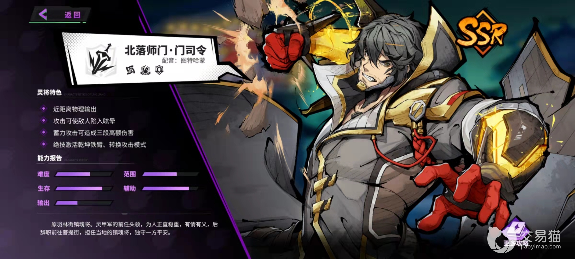门司令的技能相当于一个变身技能,使用过后,他会获得全新的普攻与主角技,这些技能会造成更大范围的伤害,并且能够打断敌人的霸体,并击碎敌人的护盾。此外,在绝技使用之后,他还能获得多达50%的减伤,这对于喜欢近战肉搏的玩家来说,非常受用。