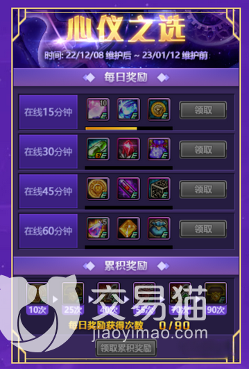 这个活动的日期的结束时间是在今年的1月12日之前。这个活动主要是让玩家在三个礼包中选择其中一个,领取的条件也非常简单,只需要满足在线的时间,就能有条件进行选择了。大概在线一个小时,就能够将奖励都拿到了。到了后续,还有其他的大奖可以拿。