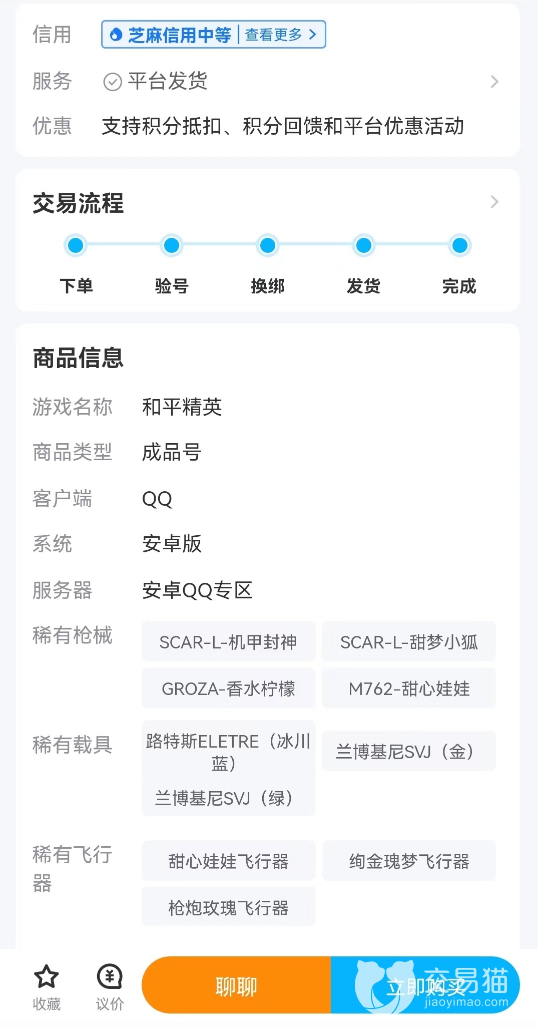和平精英账号中有大量顶尖的皮肤道具,这些是非常有价值的内容,其中一些需要玩家充值大量金额后才能获得,也是对战过程中土豪玩家的象征。如果想要以比较低的价格入手拥有大量皮肤的账号,或者是想购买段位高可以直接加入到高端局的账号,再或者是手中有这样的账号要出售。小编都推荐大家去交易猫游戏账号交易平台来进行交易,这里无论是出售还是购买,都有非常便捷和安全的设定,一起来看吧。