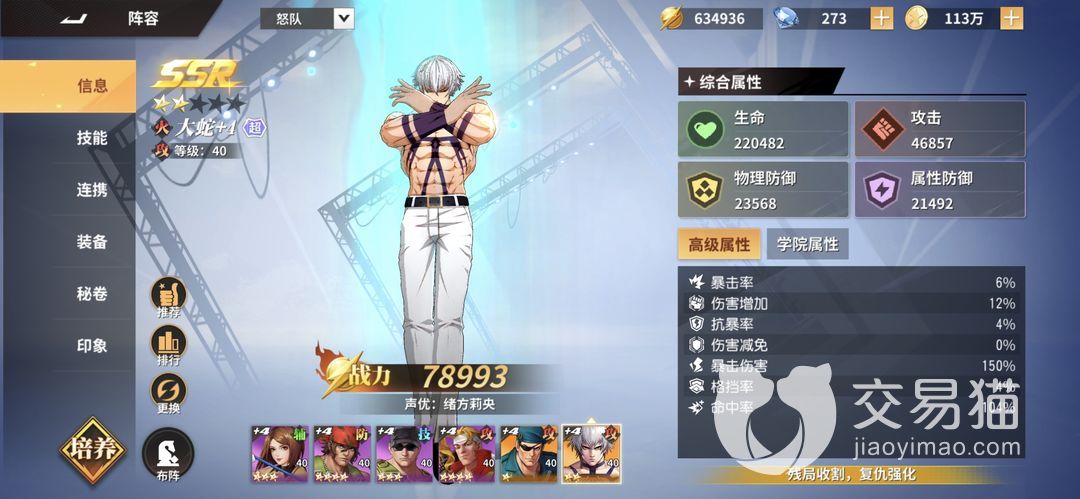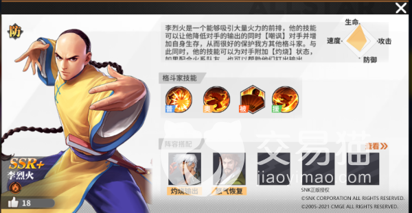 首先就是游戏的logo,大蛇,这个角色玩拳皇自然都知道,拳皇大蛇篇的最终反派,号称地球意志的化身,当年很多人靠一手阳光普照把对手打得满地找牙,全屏无差别攻击能力,可以说过于imba了,也是游戏里为数不多时刻保持悬浮状态的人,突出了不一般的设定和身份。在全明星激斗里拥有一样的技能组,强度很高。
