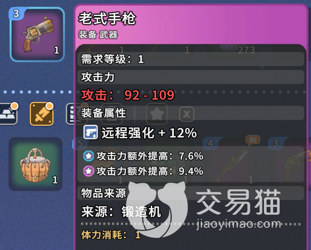 之后就是远程武器了,这里给大家推荐的是老式手枪,枪类武器的伤害面板没有近战那么恐怖,爆发伤害没有那么突出,优势在于输出放心,可以拉扯敌人容错比较高,老式手枪也是在锻造机中打造获得的,每次攻击会消耗一点体力,不过比起大剑的使用等级20级,老式手枪1级就可以使用,可以说是初始装备最佳选择,装备上可以增加百分之十二的远程强化攻击,另外可以提高百分之16的额外攻击力,这些加成让他的持续输出能力非常的给力,打boss的时候不停的点射就有不错的伤害。