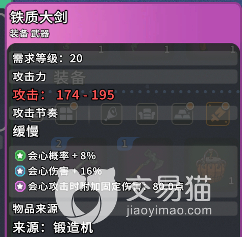 首先是剑系武器,这是一套非常传统的武器了,剑这种武器几乎出现在任何的游戏里,沙石镇时中也同样没有例外,游戏里剑系武器中最好用的是大剑,大家非常的无脑,面板很恐怖伤害非常的高,大剑的获取也不难在锻造机里可以造出来,大剑在攻击速度上比较慢,突出一刀致命,主打一个重击高伤害,大剑的攻击力区间一般在174-195之间,会心律不算高只有百分之8但是会心伤害很离谱有百分之16,同时只要暴击就会附加80点额外伤害,装备等级士20级,是一把好用获取难度又低的无脑近战装备。