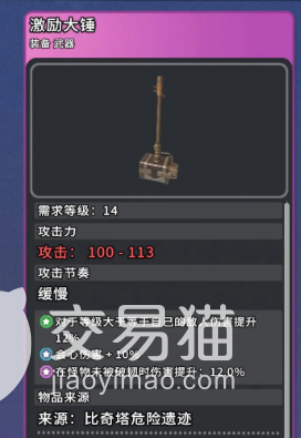 大锤武器,大锤主要是用来破盾的,简单来说就是破防在目标防御值条没有为0的状态下大锤可以迅速的破开敌方防御,之后每次攻击都会追加额外的破防伤害,大锤的攻击也不容易被打断,本身好像在攻击时有伪霸体的机制,所以通常状态下带好吸血就可以站桩输出,大锤的获取方法就和上方的大剑和枪有些不同了,大锤需要在遗迹副本里获取,大锤的穿戴等级是十四级,攻击面板100-113,效果对等级高于自己的敌人造成的伤害提高百分之十二,暴击伤害增加百分之十,敌人破防以后造成的伤害提高百分之十二,每次攻击消耗2点体力,大锤除了获取难度上比前两种装备难,使用起来是要强于前两种装备的,建议大家去弄一把。